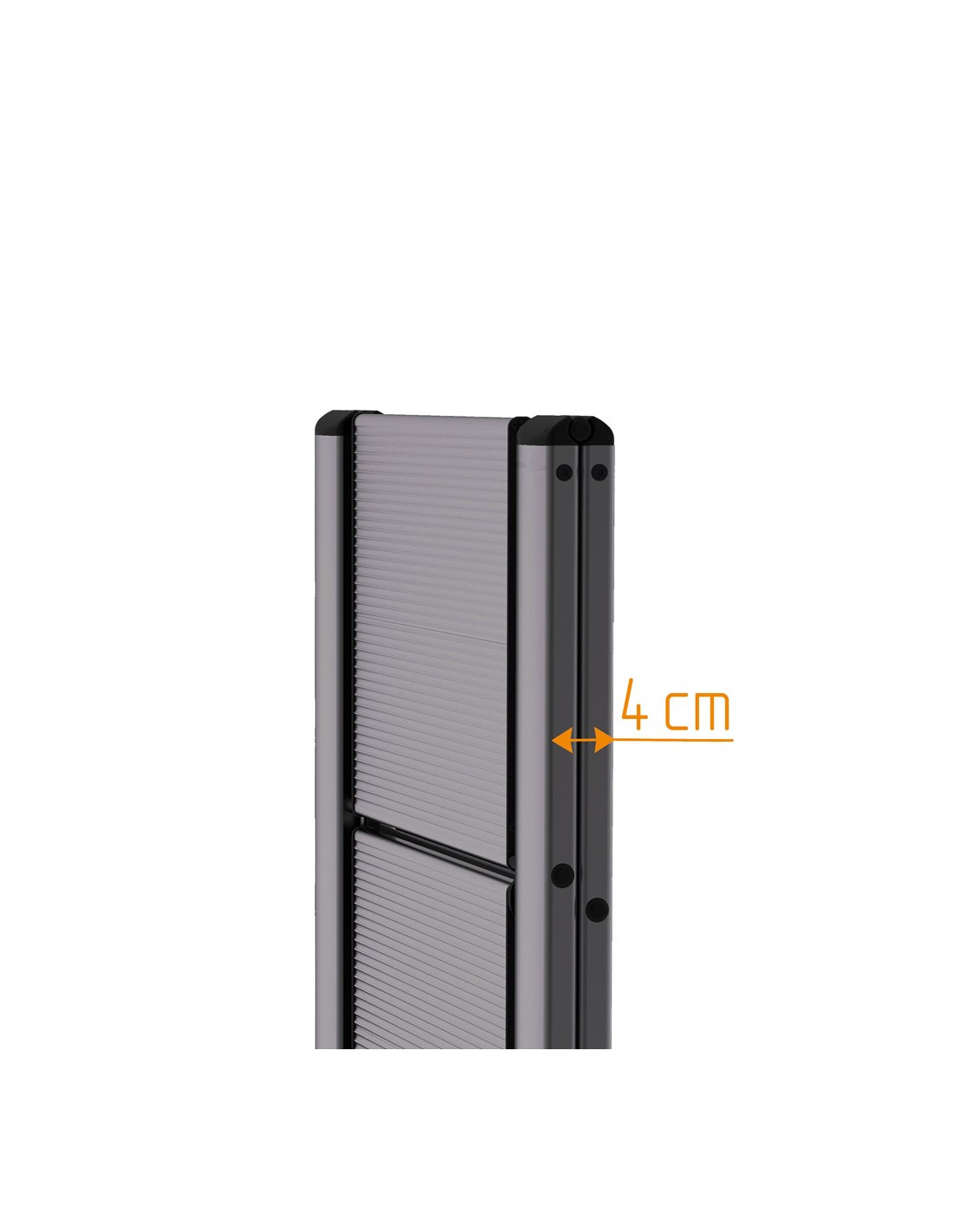 - Al plegarse los peldaños quedan plegados ocupando tan sólo 4 cm de espesor, lo que hace que sea muy fácil de almacenar y transportar