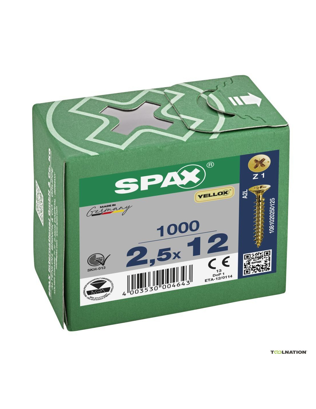 Cajas de Tornillo tirafondos universal para madera bicromatado Spax. Rosca completa, cabeza plana, punta S y ranura en cruz Z1.