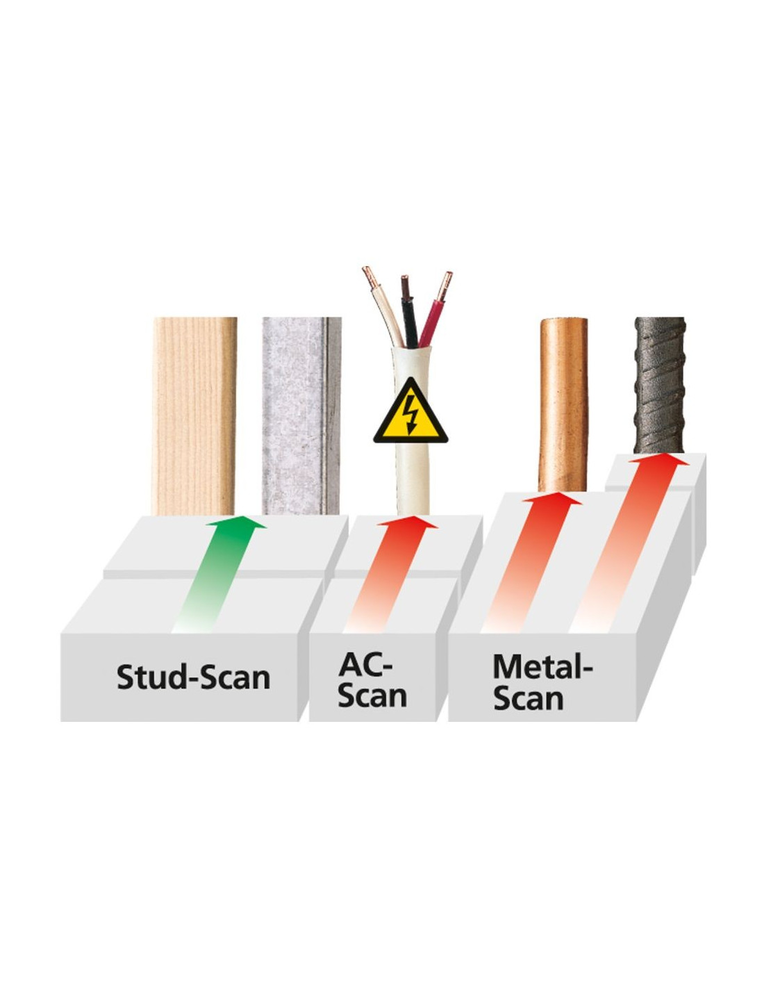 - Particularidad: en el modo de metal se puede localizar también cables no conductores de tensión debajo del revoque